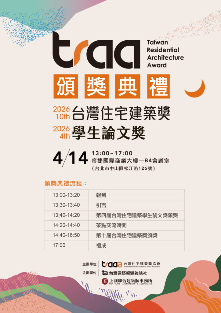 「2026第十屆traa台灣住宅建築獎暨第四屆學生論文獎」頒獎典禮,訂於2026年4月14日(週二)下午1點至5點,於將捷國際商業大樓地下四樓大會議室舉行,除住宅獎及論文獎的得獎團隊外,誠摯邀請建築界同業,以及關心台灣住宅建築發展者蒞臨觀禮。
